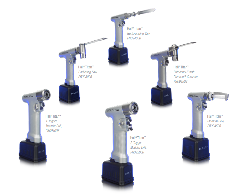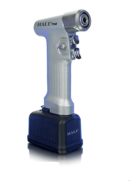 Hall® Titan™ (PRO9100B, PRO9200B, PRO9300B, PRO9350B, PRO9400B a PRO9450B) je napájen odnímatelnou dobíjecí baterií, která zajišťuje rotační, vrtací a osilační sílu pro příšlušenství (vrtáky, pilové listy nebo jiné nástavce) pro řezání kostí, vrtání, pohon a resekci měkkých tkání.